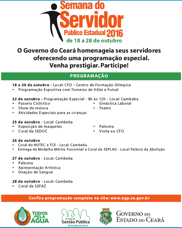 A Escola de Gestão Pública do Ceará – EGPCE – divulga a Semana do Servidor Público Estadual 2016, conforme programação que a seguir:
