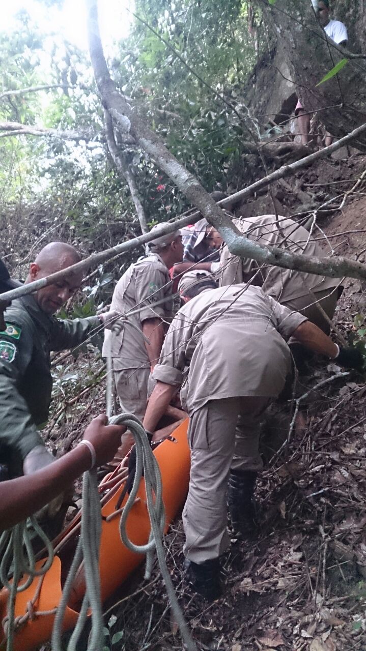 “O acesso ao local era muito difícil, o corpo havia caído cerca de 150 metros. Fizemos um sobrevoo e verificamos a inviabilidade de usar a técnica McGuire, na qual a própria aeronave serve como ponto de ancoragem para o resgate, por conta das copas das árvores, que eram muito grandes e muito fechadas”, explica o cabo Moura.