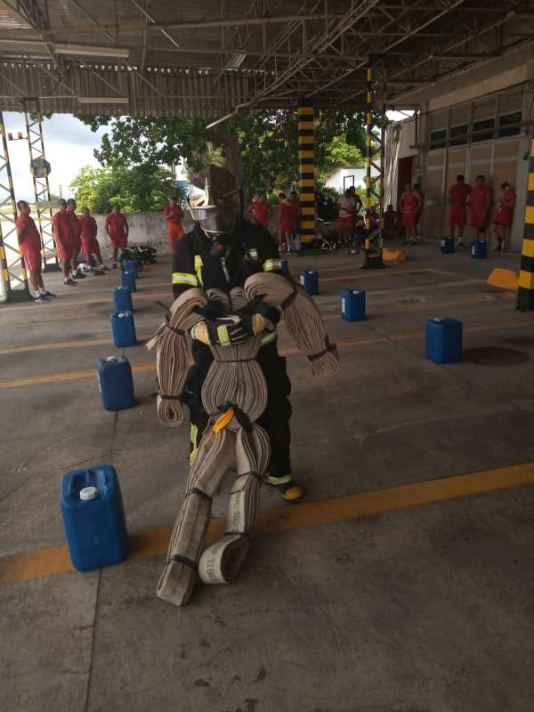 Após a explanação acerca do Programa de Treinamento Físico, todo o efetivo participou do primeiro circuito de treinamento funcional, montado no pátio de viaturas contando com provas de força, resistência, equilíbrio, condicionamento físico, vestimenta de traje de proteção e equipamento de proteção respiratória, realização de RCP e transporte de vítima.
