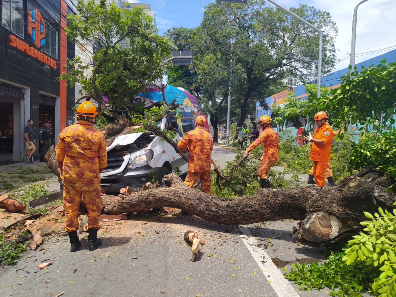 Corpo de Bombeiros corta árvore que caiu sobre Topic na Avenida Duque de Caxias