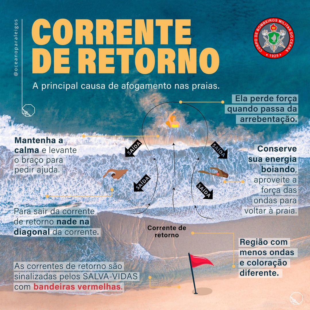 Correntes de retorno, cuidados ao iniciar atividades aquáticas. Uma das maiores causas de afogamento nas praias com onda da costa brasileira. As correntes de retorno são um risco real para banhistas. Por isso, é fundamental conhecer melhor esse fenômeno, respeitar as sinalizações e orientações dos guarda-vidas para se evitar situações de afogamento nas praias.