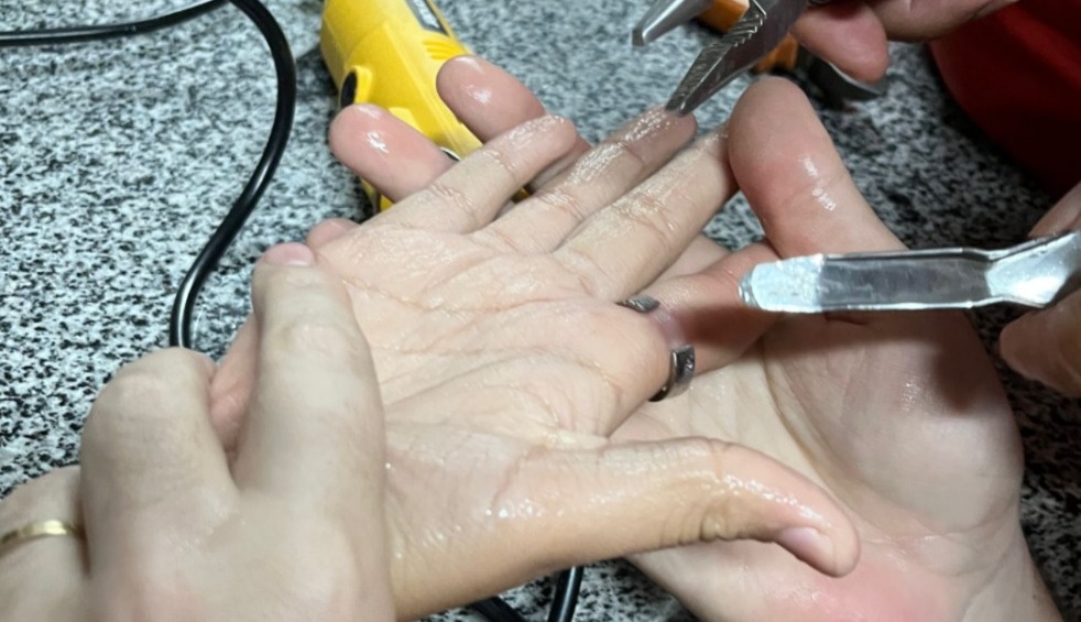 O bombeiro militar ressalta que o trabalho não oferece risco para a vítima. “Usamos uma lâmina fina de aço embaixo da aliança que protege o dedo”, afirma. “Enquanto um corta o anel, outro militar molha a mão da vítima para resfriar o metal, de modo a evitar que a joia esquente. Contudo, é mais seguro se a vítima não mexer a mão”, conclui.