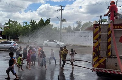 Crianças do CRAS tomam banho na frente do quartel de Sobral