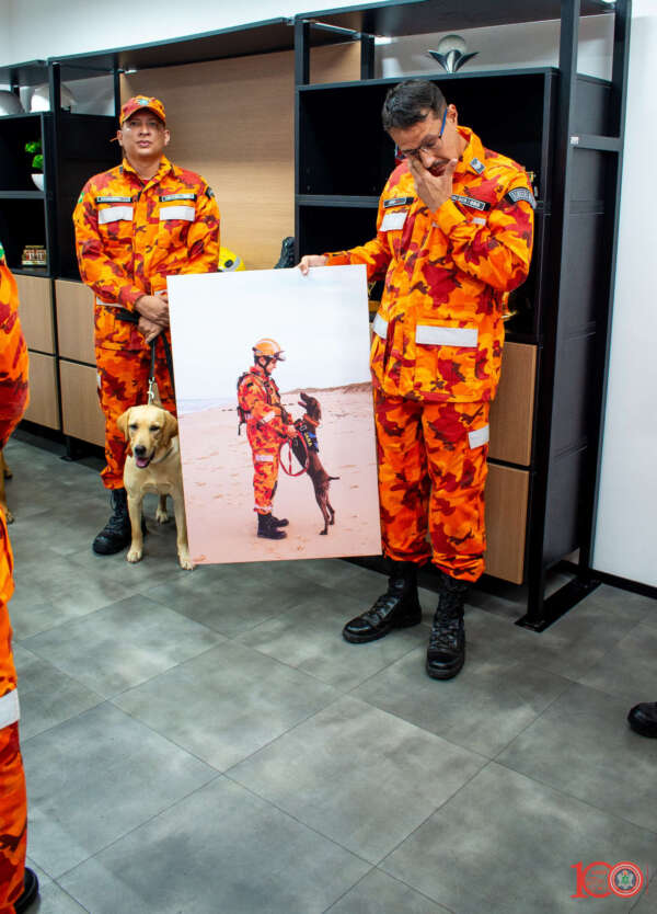 O momento também foi marcado por uma homenagem ao 3º Sargento João, condutor da cadela Iara, que infelizmente veio a óbito durante o deslocamento da equipe para a cidade de Bacabal (MA). Em um gesto de profundo respeito e reconhecimento, foi apresentada ao militar a urna contendo as cinzas da bombeira de quatro patas, bem como entregue um quadro com a fotografia do binômio, simbolizando a forte ligação construída ao longo da trajetória operacional e o legado deixado pela cadela nas missões de busca e salvamento.